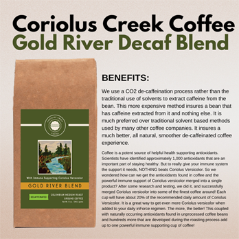 Gold River Blend is a rich, medium roast de-caffeinated, Columbian coffee that is ground to perfection and includes the powerful immune-supporting supplement known as Coriolus Versicolor. This coffee is roasted, ground, and shipped much faster than most coffees found in stores and at your local coffee house, ensuring what we believe to be the freshest coffee flavored experience you can have. Every hand-packed bag is filled with the exceptional coffee you deserve. These large beans feature undertones of juicy lemons, brown sugar, and milk chocolate that create a medium bodied, sweet tasting decaffeinated coffee with a rich flavor and aroma. If you are new to buying freshly roasted coffee and don’t know where to begin, or it you’re a veteran, this selection will satisfy your coffee craving!