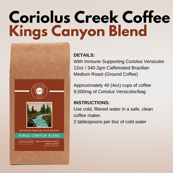 Kings Canyon Blend is a rich, medium roast caffeinated Brazilian coffee that is ground to perfection and includes the powerful immune-supporting supplement known as Coriolus Versicolor. This coffee is roasted, ground, and shipped much faster than most coffees found in stores and at your local coffee house, ensuring what we believe to be the freshest coffee flavored experience you can have. Every hand-packed bag is filled with the exceptional coffee you deserve. You will be surprised by how smooth and light it is on your palate!